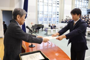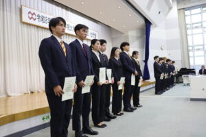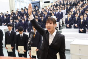 壮行会では小林学長から認定書が授与され、強化指定部を代表して、自転車競技部の嵯峨希来が「強化指定部の選手としての誇りを持ち、部活動や勉学、地域貢献活動に精一杯打ち込む」と誓いの言葉を述べました。