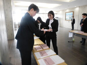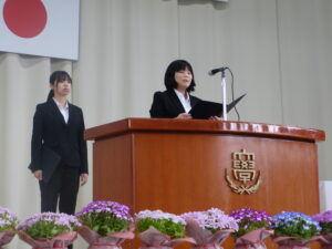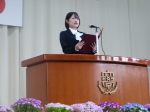 式典では、新入生を代表して、八戸学院大学短期大学部こども教育学科の中村向日葵さんが「これから美保野キャンパスで過ごすことになりますが、大学生、短大生としての自覚を持ち、自分の夢に向って まい進していく覚悟です。」と宣誓しました。